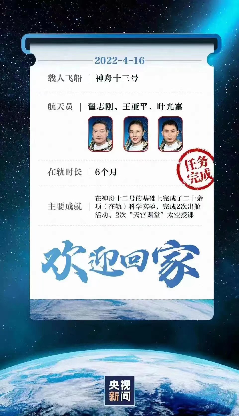2021年10月16日,神十三成功发射,将航天员翟志刚、王亚平、叶光富送入太空。神十三航天员创造多个辉煌后于今日回家,在这春光明媚的日子里,看到精神奕奕的航天员英雄凯旋归来,我们深刻体会到生在新中国,长在国旗下的幸福与骄傲。何其有幸生于华夏,见证百年,见证梦想成真!