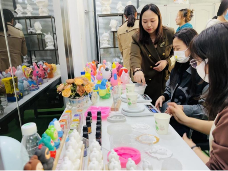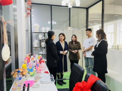 黄瑛带领老师们走进项目工作室现场,参观体验“后羿石膏彩绘”与“织女DIY手作工作室”员工创新创业项目。