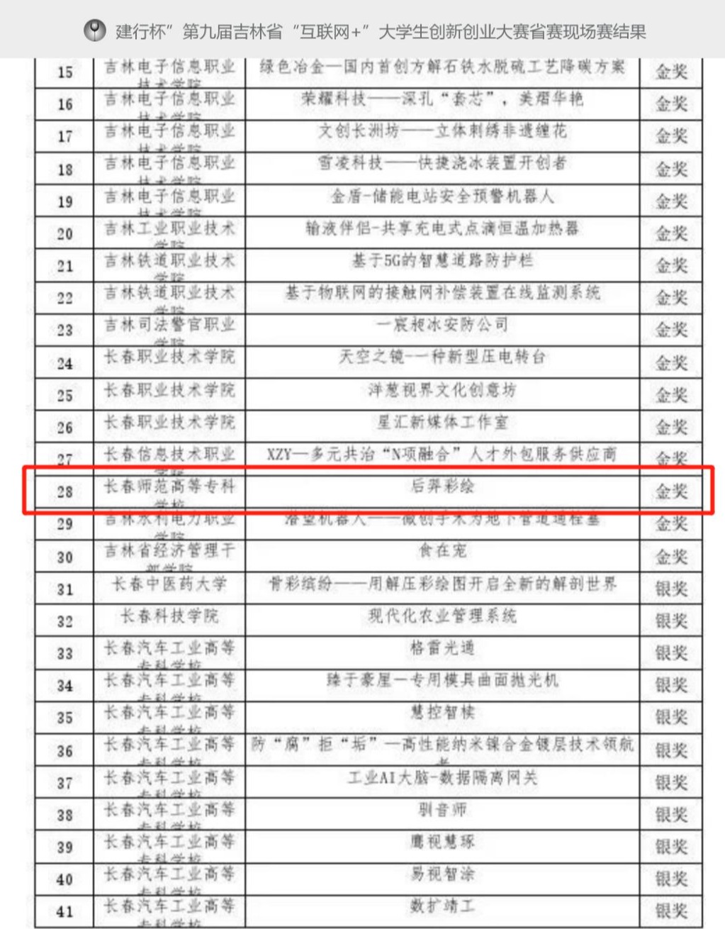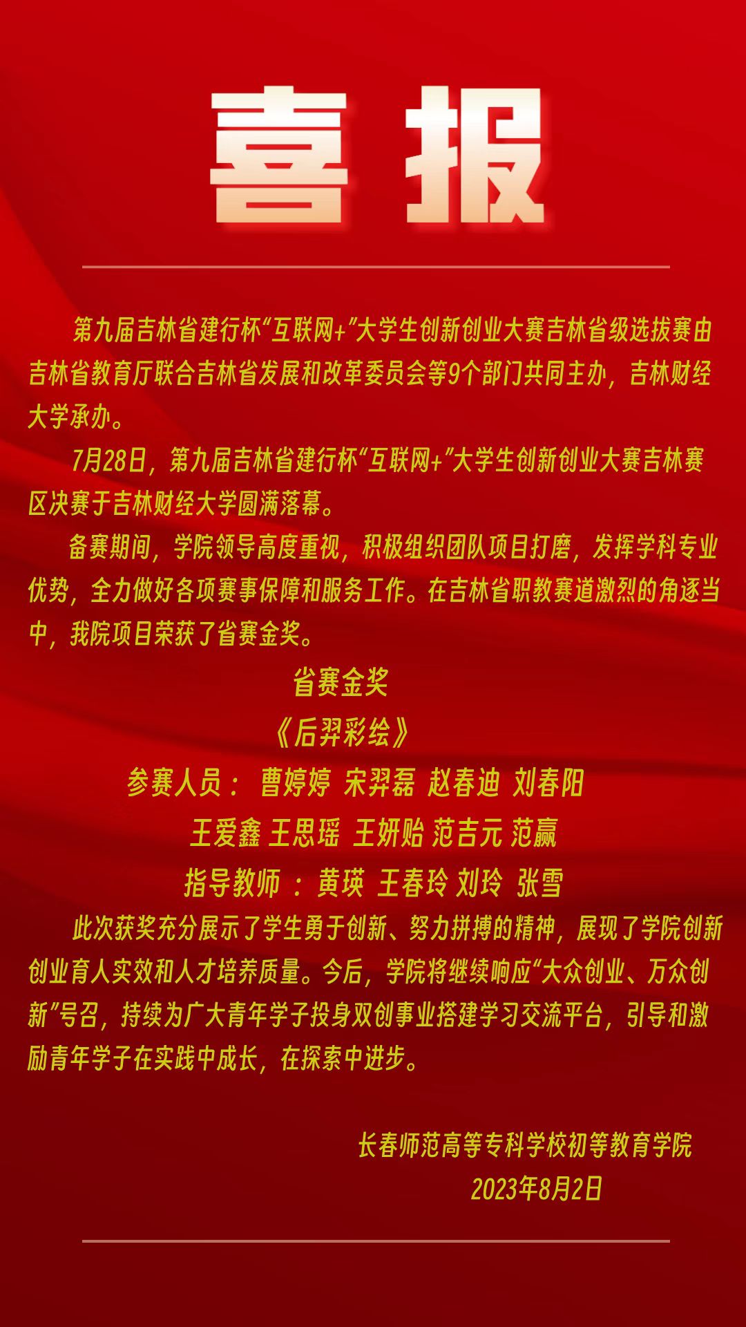7月28日,第九届吉林省建行杯“互联网+”老员工创新创业大赛吉林赛区决赛在吉林财经大学圆满落幕。公司共获省级奖项1项,由校团委学团负责人孙潇潇和公司学工科科长王春玲带队,3377体育黄瑛、王春玲、刘玲、张雪老师指导,曹婷婷、宋羿磊、赵春迪、范吉元、王妍贻、范赢、王思瑶、王爱鑫、刘春阳十名同学负责的《后羿彩绘》项目获得省级金奖,并进入国家赛级训练营。